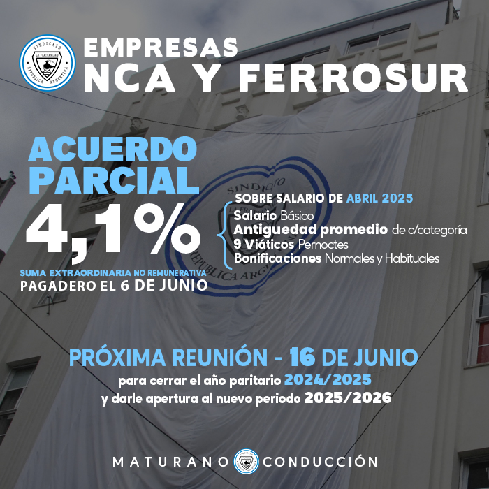 Nuevo acuerdo parcial con las empresas privadas de cargas NCA y Ferrosur. Próxima reunión planificada para el 16 de junio, para cerrar el periodo 2024-2025 y darle apertura al periodo 2025-2026.