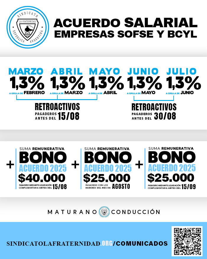La Comisión paritaria de La Fraternidad alcanzó un nuevo acuerdo de recomposición salarial para las empresas SOFSE y BCyL.