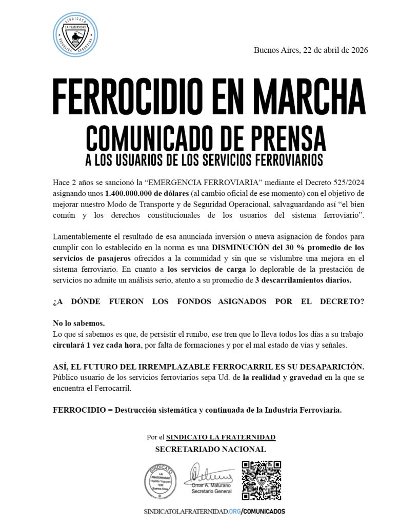 Hace 2 años se sancionó la “EMERGENCIA FERROVIARIA” mediante el Decreto 525/2024 asignando unos 1.400.000.000 de dólares (al cambio oficial de ese momento) con el objetivo de mejorar nuestro Modo de Transporte y de Seguridad Operacional, salvaguardando así “el bien común y los derechos constitucionales de los usuarios del sistema ferroviario”.