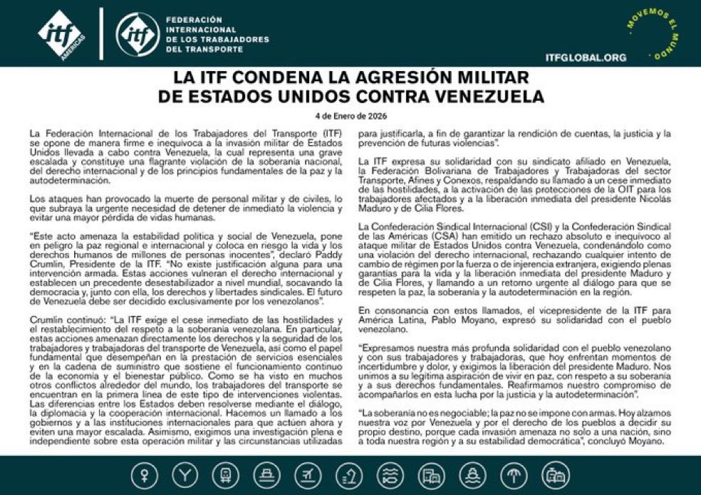 La Federación Internacional de los Trabajadores del Transporte (ITF) se opone de manera firme e inequívoca a la invasión militar de Estados Unidos llevada a cabo contra Venezuela, la cual representa una grave escalada y constituye una flagrante violación de la soberanía nacional, del derecho internacional y de los principios fundamentales de la paz y la autodeterminación.