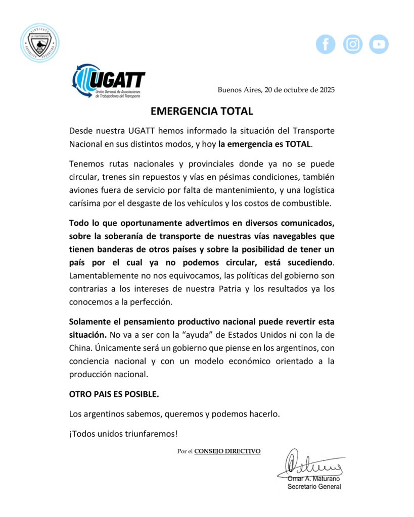 EMERGENCIA TOTALDesde nuestra UGATT hemos informado la situación del Transporte Nacional en sus distintos modos, y hoy la emergencia es TOTAL. Tenemos rutas nacionales…